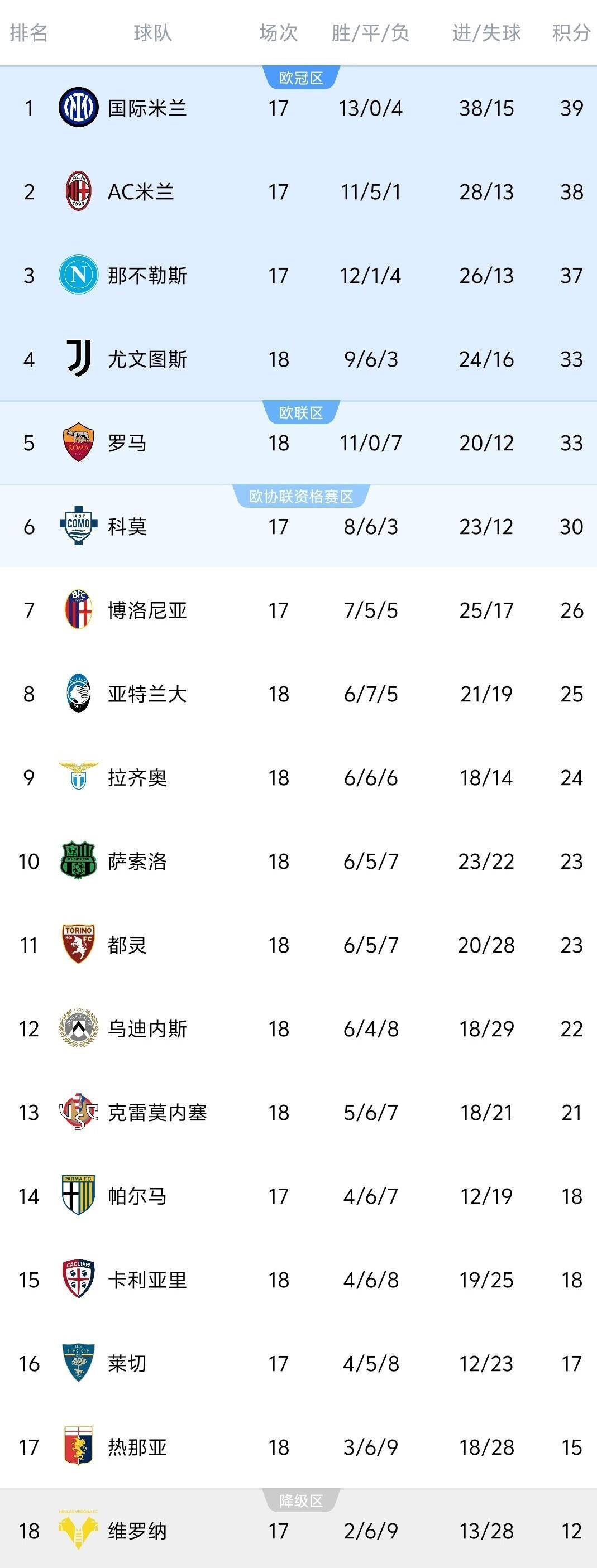 本场比赛结束后,意甲联赛第18轮的比赛也告一段落。 最新的积分榜显示,国际米兰凭借这场胜利,重新回到了联赛第一的位置。 排名第二和第三的球队与国米的分差仅有2分,竞争异常激烈。 由于赛程安排,部分球队的第16轮比赛延期举行,因此他们在积分榜上少赛一轮。
