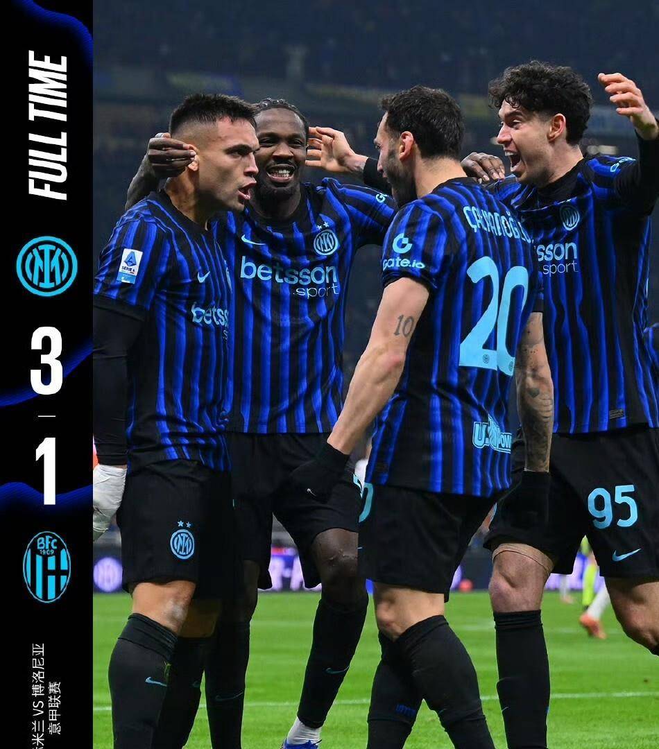 另一场焦点战在国际米兰与博洛尼亚之间展开。 两队渊源颇深,就在2025年12月20日的意大利超级杯决赛中,双方常规时间战成1-1平,博洛尼亚在点球大战中以3-2取胜夺冠。 此次意甲再相逢,国际米兰展现了截然不同的面貌。