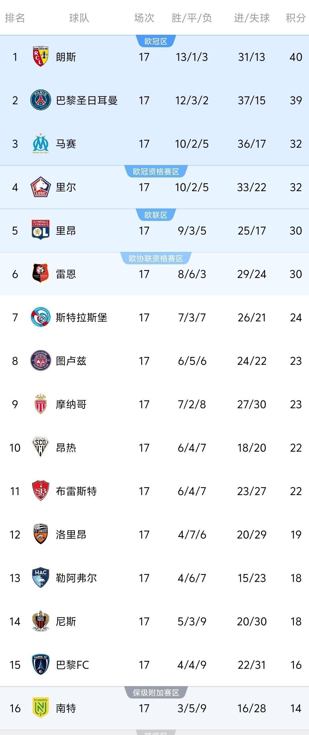 随着这场比赛结束,法甲联赛第17轮的全部赛事完结。 在最新的积分榜上,取胜后的巴黎圣日耳曼积分紧追榜首的朗斯队,双方分差仅为1分。 巴黎FC则继续位于联赛中游。