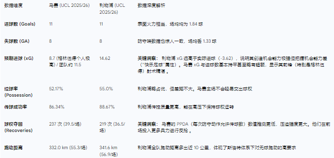 利物浦的 xG 亏损 是其近期战绩不佳的根源。根据 21 的数据,利物浦在 xG (14.32) 上遥遥领先马赛 15,创造了大量“重大机会”(Big Chances),但转化率低下。马赛则相反,虽然创造机会总量较少,但把握机会能力极强,属于“一击致命”型。
