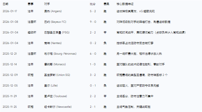 马赛在过去 10 场各项赛事中的表现呈现出极高的方差,这种“过山车”式的状态是德泽尔比战术体系的典型特征——在高风险的后场倒脚诱敌深入与前场快速突刺之间寻找平衡。