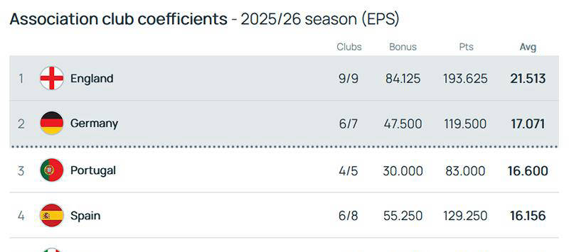 从积分榜来看,英超以21.513分高居榜首,领先第二名德甲逾4分,显著拉开差距。紧随其后的是葡超、西甲和意甲,积分紧密接近,均围绕第三到第五名展开激烈争夺。而第六名的波兰联赛和第七名的法甲积分分别停留在14.125分和14.035分,实质上已缺乏追赶机会。