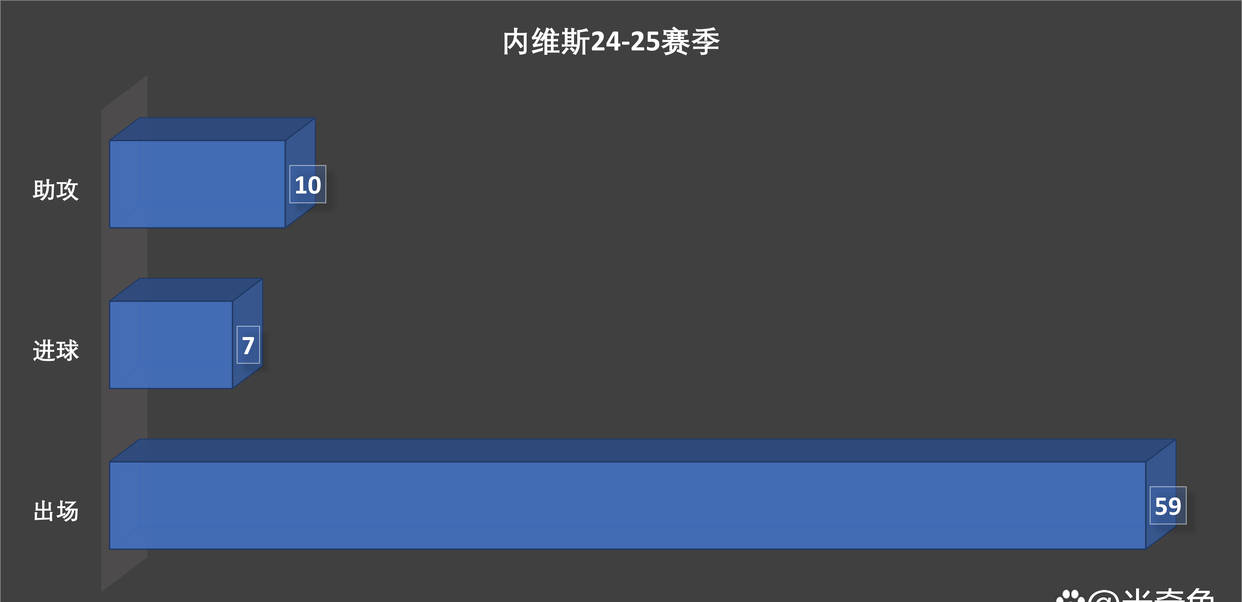 上赛季他加盟巴黎共出场59次,打入7球并送出10次助攻。在欧冠半决赛对阵阿森纳和世俱杯对阵皇马时,内维斯展现出强大的防守能力。而在新赛季,他开始展示了进攻端的才华,吸引了更多人的关注。