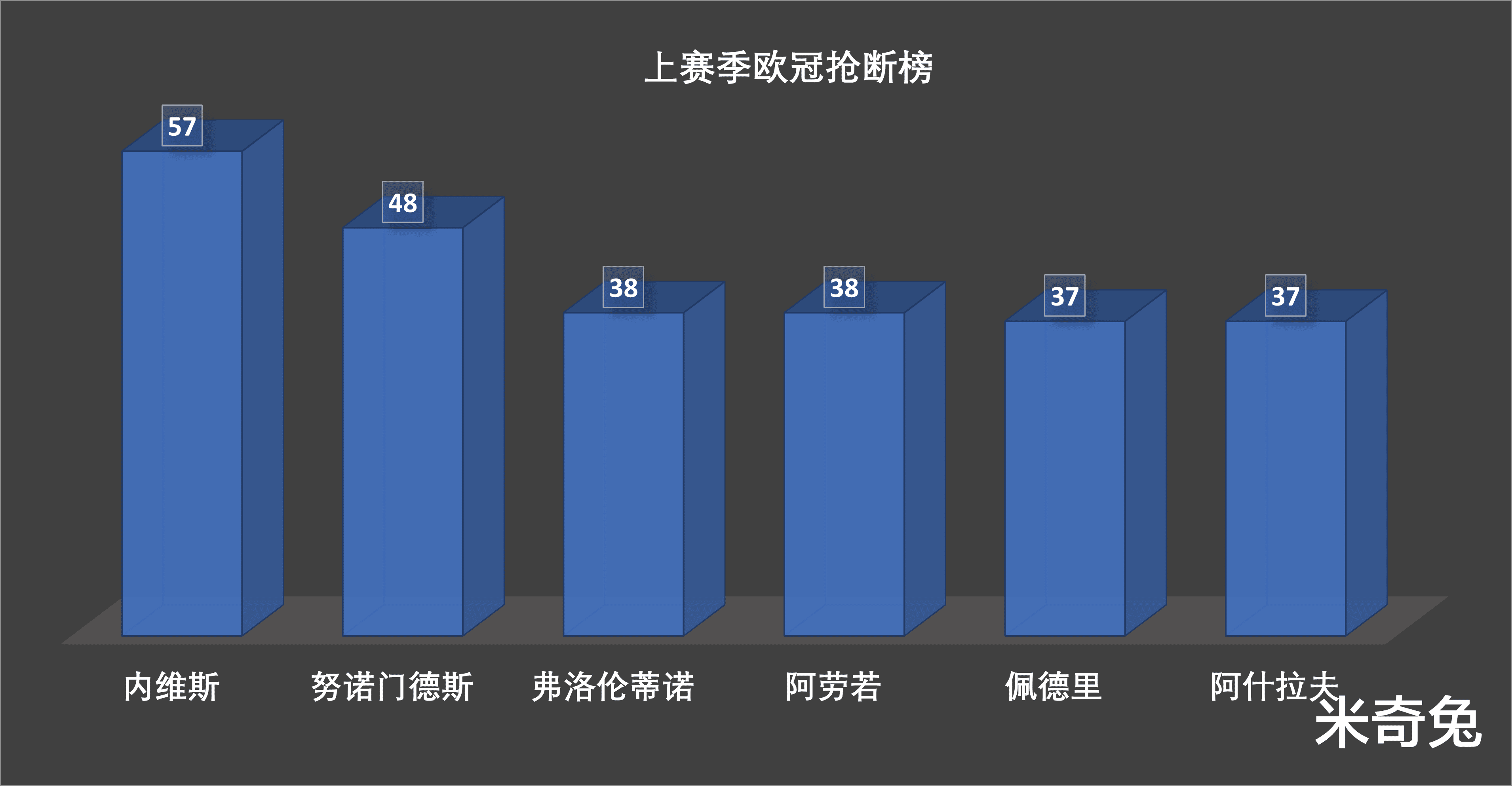 因此,去年的欧冠数据也相当令人震撼:他不仅在跑动距离上居于前列,抢断数同样名列前茅,一对一对抗的成功率也紧随其后,显示出他在攻防两端的综合作用力。