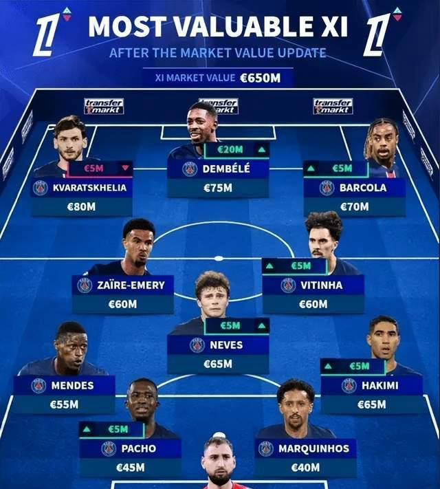 其中,新加盟巴黎的克瓦拉茨赫利亚以8000万欧元的身价稳居榜首,向世人展示了他夺冠赛季的实力水平。此外,登贝莱在本赛季取得了职业生涯的新突破,身价达到7500万欧元,如果保持这样的表现,他有机会争夺个人奖项,比如金球奖。