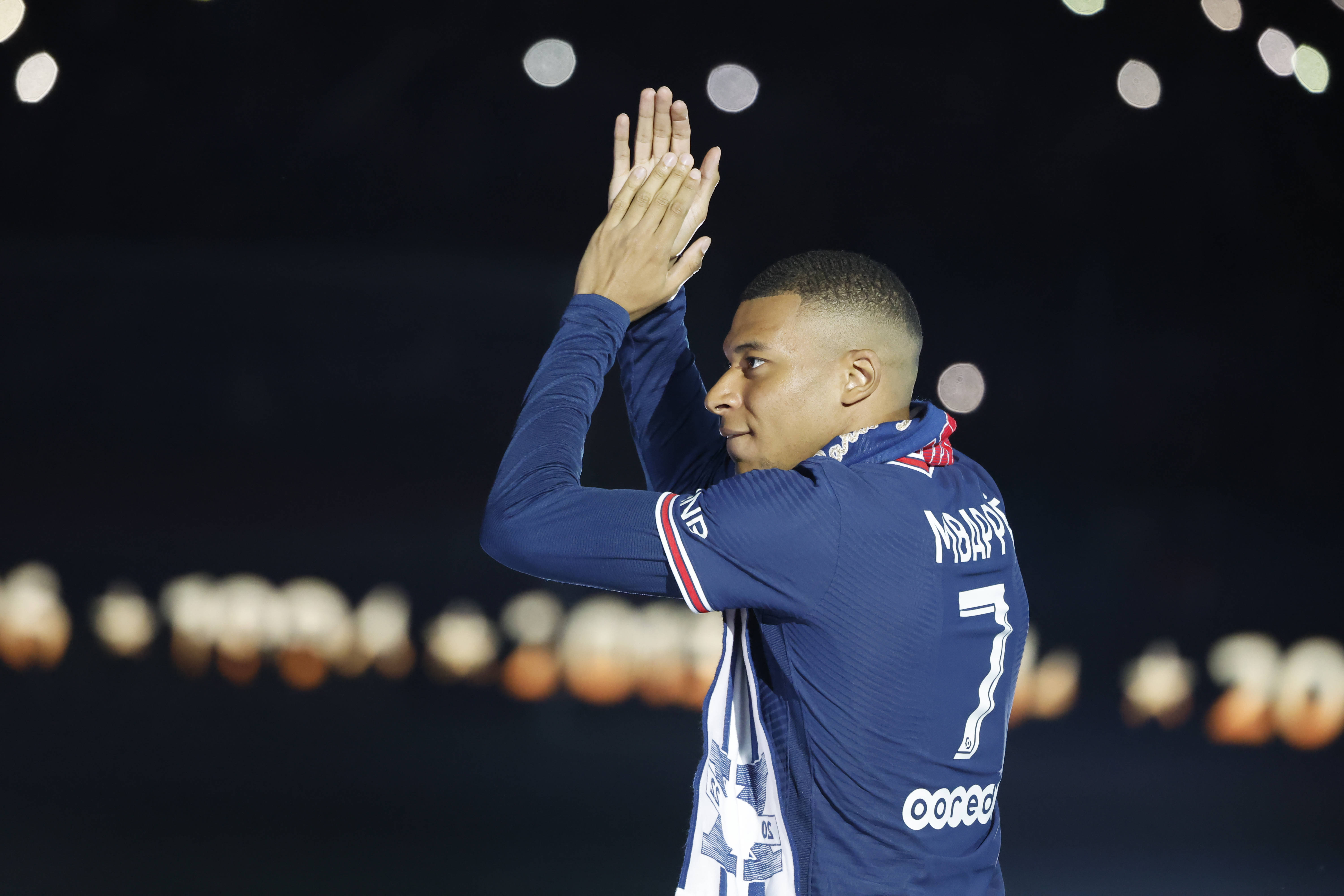 5月21日,在法国巴黎王子公园球场,巴黎圣日耳曼队球员姆巴佩向球迷致意。
