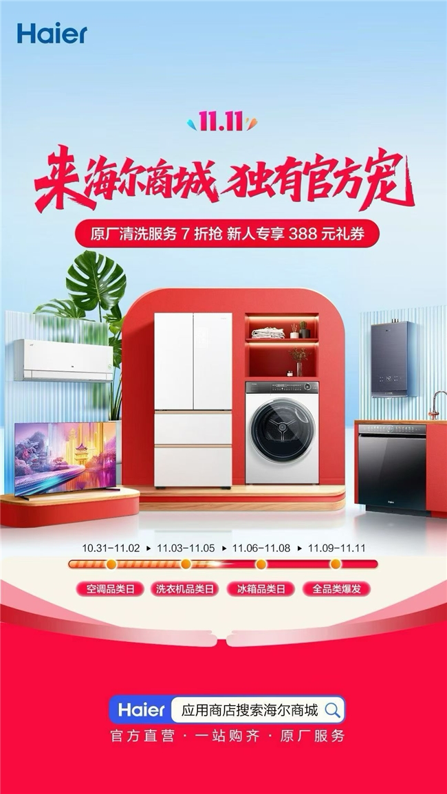 而贯穿整个双11的福利体系更将“官方独宠”落到实处:套系一键加购至高享9折优惠;麦浪套系、小红花套系购2件以上加赠清洗服务;新人下载并注册海尔商城App或打开海尔商城小程序可领388专属券包;还有官方清洗服务7折购等专属特惠让品质和服务触手可及