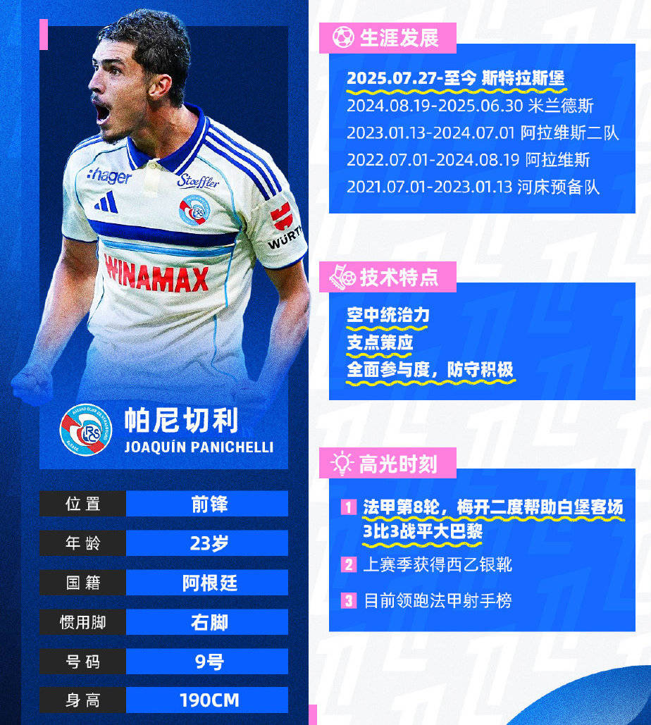 2024-2025赛季,经过艰苦的恢复,帕尼切利重返赛场,租借加盟西乙的米兰德斯,并在44场比赛中打进21球,助攻8次,斩获西乙银靴,彻底证明了自己。随后,他在今年7月被法甲球队斯特拉斯堡以1650万欧元的转会费签下。很多人对他能否适应法甲产生疑问,但帕尼切利凭借出色的表现,打破了这些质疑。他不仅在与巴黎圣日耳曼的比赛中发挥了关键作用,还在全赛季中屡屡为斯特拉斯堡提供关键进球和助攻。