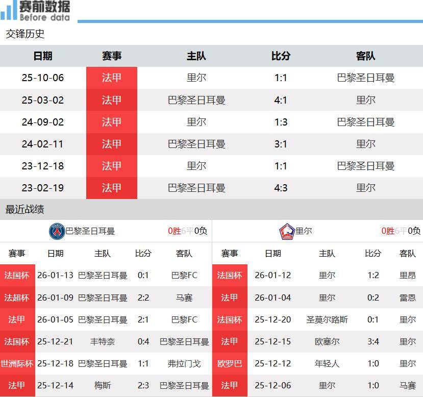 第一:两队情况!法甲17轮战罢,巴黎12胜3平2负积39分排名第二,落后榜首朗斯1分;里尔10胜2平5负积32分排名第四,与第三名马赛同分。上轮法甲,巴黎主场2-1小胜巴黎FC,豪取联赛三连胜,上周末法国超级杯2-2战平马赛,点球大战夺冠,本周中法国杯爆冷主场0-1不敌巴黎FC无缘16强,爆出了足坛本周的一个超级大冷门;里尔主场0-2不敌雷恩,本周一法国杯主场1-2不敌里昂无缘16强。