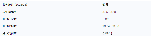 根据2025/26赛季的最新统计,马德利在12场英超比赛中场均出示3.58张黄牌,并判罚21.58次犯规 。他的“场均犯规/黄牌比”约为4.9,这意味着他在出牌前通常会给予球员一定的口头警告空间 。然而,在处理高强度压迫引发的身体对抗时,他表现得相当果断。例如,在本赛季维拉6-1大胜布莱顿的比赛中,他判罚了多达40次犯规,刷新了赛季纪录 。