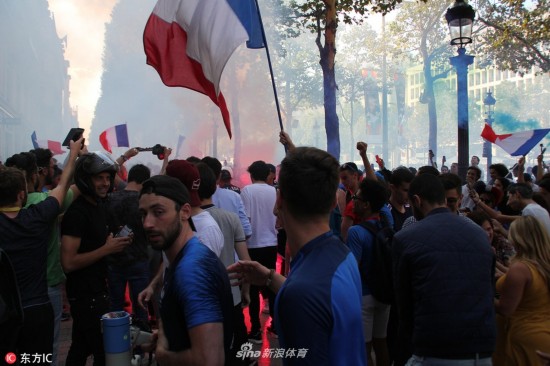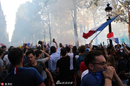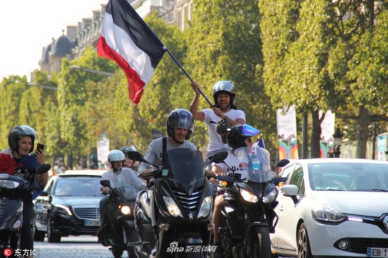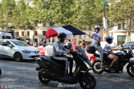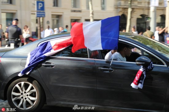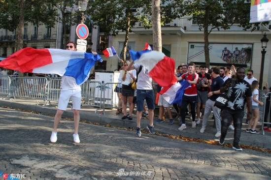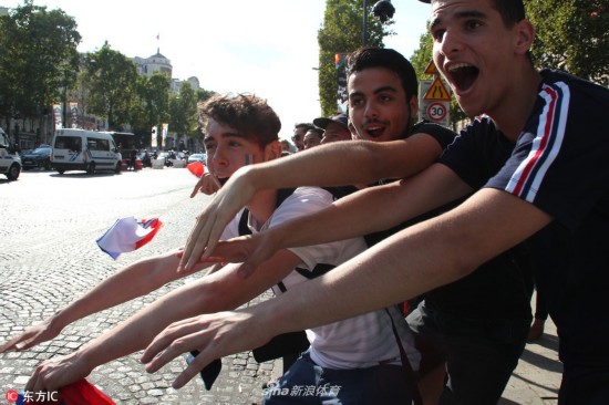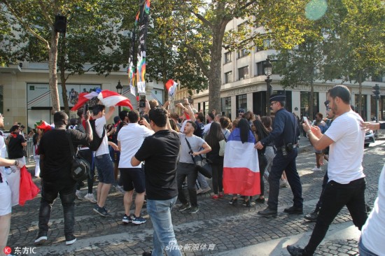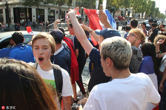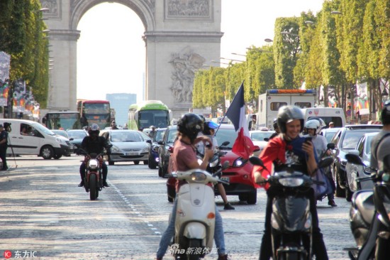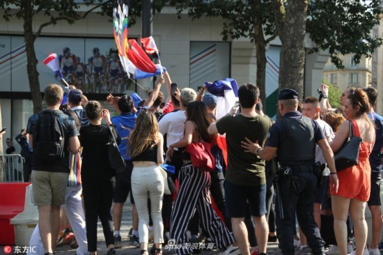当地时间2018年7月5日,法国巴黎,法国球迷巴黎街头庆祝球队晋级,凯旋门前人群集聚。
