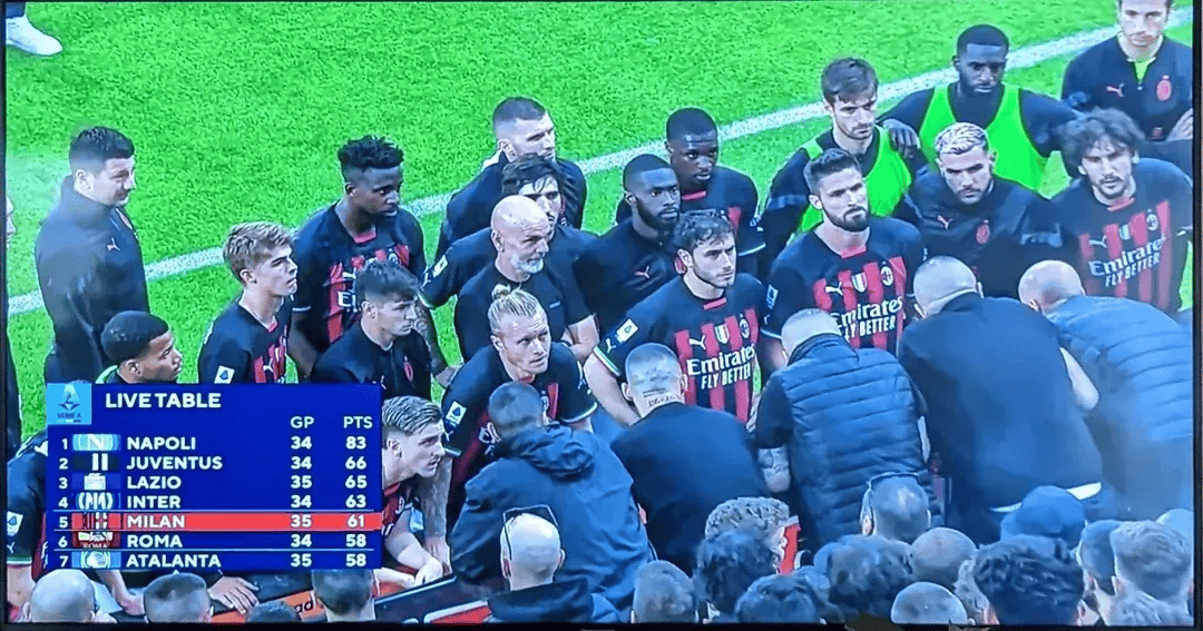 罗冉峰则介绍了他检索到的信息。以“lecture”“dress-down”等关键词搜索,并没有太多球迷赛后训话的例子。比较容易找到的案例有三个:第一个是很多国内球迷讨论“赛后对话”时引用的图片,AC米兰的球员像学生一样在球迷面前“乖乖听训”。这是2023年AC米兰在意甲赛事中0:2不敌斯佩齐亚的场景。另一个例子也出现在意甲赛场,2015年,亚特兰大的赛前训练曾被球迷训话打断。第三个例子出自法甲,2023年里昂主场1:4惨败给巴黎圣日耳曼后,也接受了看台球迷的训话。